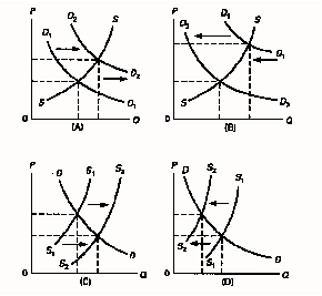 15. ¿Cuál(es) de los gráficos ilustra(n) el efecto de un incremento en los salarios de los trabajadores de la industria de automóviles sobre el mercado de automóviles? A) Sólo A 16. ¿Cuál(es) de los gráficos ilustra(n) el efecto de una disminución en el precio de las computadoras personales sobre el mercado de software? A) Sólo A 17. Los excedentes conducen los precios hacia arriba; la escasez conduce los precios hacia abajo. A) Verdadero B) Falso18. Un "incremento en la cantidad ofertada" es provocado por una disminución de los costos de producción. A) Verdadero B) Falso19. "La Oferta" se refiere a la cantidad de un bien que el productor ofrecerá en el mercado a un cierto precio. A) Verdadero B) Falso20. Un incremento en la demanda acompañado de un incremento en la oferta incrementará la cantidad de equilibrio pero el efecto sobre el precio de equilibrio será indeterminado. A) Verdadero B) Falso21. Si dos bienes son complementarios un incremento en el precio de uno provocará un incremento en la demanda del otro. A) Verdadero B) Falso El Profesor | ||||||||||||||||||